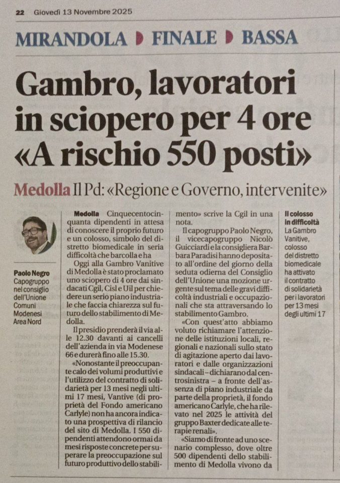 Una sofferenza durata un’anno è oggi resa manifesta da uno sciopero, quello dei lavoratori minacciati di licenziamento dallo stabilimento che già nel 2011 richiese un tavolo di crisi. Allora era di proprietà della società Gambro (ex Dasco) e si parlò di 400 dipendenti a rischio. Oggi è di proprietà della società Vantive (che lo ha recentemente rilevato dalla Baxter) e si parla di 550 lavoratori.